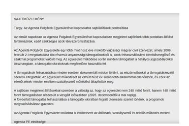 Az elmúlt napokban az Agenda Polgárok Egyesületével kapcsolatban megjelent sajtóhírekre a szervezet közleményben reagált, amelyben szükségesnek tartotta a tények tisztázását.