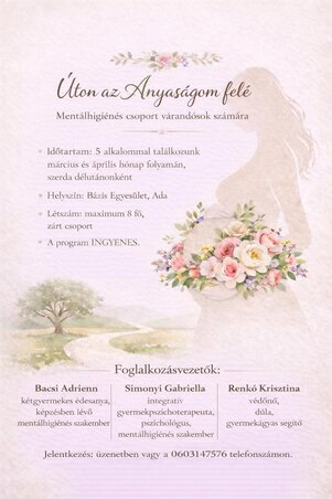 Úton az anyaságom felé címmel hirdetnek mentálhigiénés foglalkozássorozatot várandós nők számára Adán. A beszélgetések zárt csoportban, öt alkalommal valósulnak meg, az adai Bázis Egyesületben. Az első találkozó március 25-én, szerdán lesz, ahová még lehet jelentkezni, a szervezők várják az érdeklődőket. A foglalkozásokat vezetik: Bacsi Adrienn kétgyermekes édesanya, képzésben lévő mentálhigiénés szakember, Simonyi Gabriella integratív gyermek-pszichoterapeuta, pszichológus, mentálhigiénés szakember, valamint Renkó Krisztina védőnő, dúla, gyermekágyas segítő.