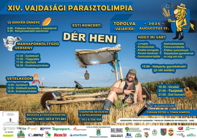 Augusztus 17-én rendezik meg Topolyán a kenyérszentelőt és a Vajdasági Parasztolimpiát. A vásártérről 8 órakor indul a fiákeres felvonulás. Az új búzából sütött kenyeret a Sarlós Boldogasszony-templomban 9.30-kor kezdődő hálaadó misén szentelik meg. A Vajdasági Parasztolimpia a délutáni órákban veszi kezdetét a vásártéren. A szervezők számos meglepetéssel készülnek. A programok egyebek mellett lovaglási lehetőséget, kirakodóvásárt, parasztjakuzzit, valamint a gyerekeknek habpartit kínálnak a tűzoltók közreműködésével. A csapatok többek között gumicsizma-hajításban, szalmabála-dobálásban, petrencerúd-tartásban, valamint más ügyességet és találékonyságot próbára tevő, esetenként mókás versenyszámokban vetélkednek. Szentesről is benevezett egy csapat, továbbá jelen lesznek a szajániak, kishegyesiek, bácsfeketehegyiek, zentaiak, a többszörös bajnok kavillói csapat, valamint még sokan mások. A főnyeremény egy wellnesshétvége az egész csapat számára, amelyet a támogatók közül a Sat-Trakt biztosított. Női és férficsapatok jelentkezését továbbra is várják a 063/850-84-04-es telefonszámon. Az idei parasztolimpia sztárvendége Dér Henrietta, aki az estére másfél órás fellépéssel készül. Napközben a Beat Duó szórakoztatja a nagyérdeműt.