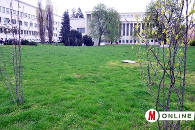 A Városi Kertészeti Közvállalat dolgozói tegnap átültették azokat a japán cseresznyefákat, amelyek a báni palota előtt elterülő, zöld felületen voltak.